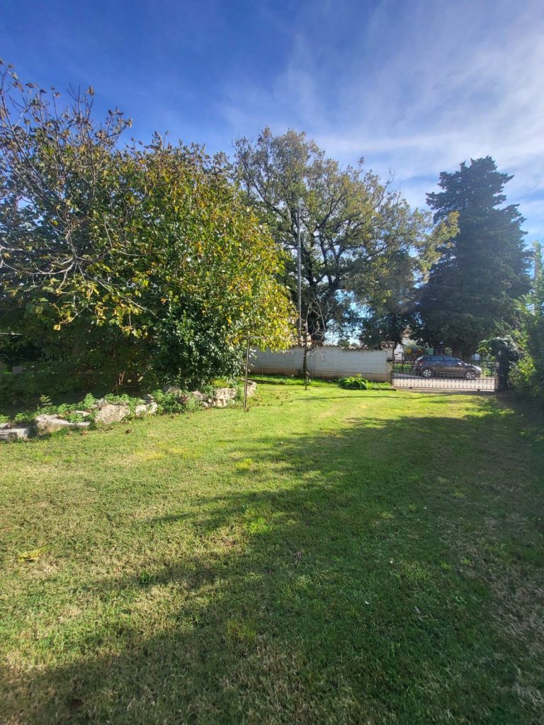 Prostrano dvorište okruženo zelenilom, u njemu se nalazi konoba s terasom i šternom.